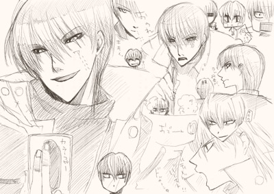 | 一昨日のバトンで、妙に社長を貶した気がする(笑) 後、追加で突っ込みどころを…! 社長の目が燃えていたとき、ありましたよね…、いつだったか…。 あのシーンは大爆笑でした。ぎゃはははは……っ…っ(涙目/言葉にならない) いや〜社長って面白い。いじられキャラなのか…?お前、社長ファンを敵に回したぞ…!!!失言だらけのマイ脳内。 ス、スミマセンっ、私っ社長も大好きですよ…!!!(遅) 懺悔の気持ちを込めて、社長尽くしのTHEラクガキ☆ ![]() うわ〜っうわ〜〜っ!何かイヤ〜(笑)しかも、全然懺悔になってないよ、この絵!元絵がすごく大きいんで、日記用に縮小したらイロイロ掻き消えた。社長って本当に、描いててコロコロ変わってしまう。難しいキャラです。もっとこう、カッコよく、イロッぽく、帝王っぽく、独裁者っぽくならない物ですかね〜。 それにしても、ボールペンの一発書きって辛い!直したくても直せない(涙)左端のでかい社長は、もう少し如何にか為らなかったのか、私!!!どう考えてもおかしいぞ(涙) 萌え箱が届いた。 え、えとっ!本日、ツキル君から本が届いたんです…!自分のはいいとして、ツッキーのが読める…!うわ〜いvv来週辺りにオフラインページを作りますので、興味をもたれた方は是非…っvvうわっうわっ!いっぱい宝物入りだし!!!ありがとうっツッキー…!アナタに出会えて私は幸せ…!!!受け取れ、マイスイートハート!!!シュバアアアア!!! そんなツキル君からバトンを頂きましたvv後でゆっくり答えます〜vvあはは、人間バトンだなんて、ダメ人間の私にどうやって答えろと…(暗) 一次創作バトンでちょろっと書いた、殺し屋さんたちのラクガキ☆→■ |