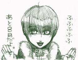 | 8600hitのリクを、本日ようやくupいたしましたっ(涙) すすき様、大変お待たせしてしまって申し訳ありませんでした!!!しかもアンナで(落込) 社長の顔が描けなくて、3日くらいゴシゴシ消しまくっていたらコピー用紙(に下絵は描いているのです)が破けそうに為りました。透かさなくてもうっすら向こう側が見えるという…。流石にこれ以上消したらヤバイ…!!!と思って、とりあえずトレースしてパソに取り込んで、モニタ上で修正。 大変!!!更にやばくなったみたい…!!!(タブレットに慣れていないから) イロイロとくじけながら何とか仕上げました。ホントこんなでゴメンナサイ(涙)どうか心の奥底で、「こんな迷惑なもんも押し付けやがってこのやろう!」と罵ってください。もしくは五寸釘でも打ち付けてやってください。苦情ドン☆とこい!です…っ、くうぅっ。 そして本日今更ながらtopに社長をはめ込みました。 【その時の作業中の社長↓】 ![]() 配色すっごーい☆ありえな〜い☆ お正月気分ももぅサヨナラしなくてはいけないというのに…。本当は他にもたくさんイラストをupする予定だったのですが、イロイロやっていたらタイムアップです、もぅ無理です、もぅおしまいです。 残りのリクはまた今度〜vv下絵は半分以上出来上がっていますので☆ 「あああ、お母さん、お星様が見えるよ。」 「夜だからね。」 古畑さんをやっと全部見ることが出来ました!時代に取り残されるマイウェイ。ロンリーロンリーウルフ(意味不) どうしてっ!どうして田村さんってこんなにカッコいいんだろう…。友人と語り合った過去のあの日々が懐かしい。輝かしい過去の麗しき語らいの日々よ。今一度、誰か田村さんについて語りましょうよ!あのステキな物腰!低く囁くような声音!!!抱きついたらやんわりと受け止めてくれそうなあの広い胸元へ!!!いざ行かん!永久の旅路へ〜!!!! 死 ね そうだ〜!本日はですね、いただき物をたくさんupいたしましたvv頂いたのは大分前なんですがっやっと!!皆様ありがとうございましたvv明日辺りには、年末の時のトップイラストもupしようかと思います。画像庫に置くにあたって少し縮小しますね〜っ。 ありゃ〜イロイロお知らせもあったハズなんですが、思い出せません…。 ぶっ飛んでいった脳細胞よ、カムバックミー。 <と り あ え ず 以下私信> A様がたっ> 例の企画…ぜひ参加したいと思います…!ですが、メンバーがやけに豪華なんで…私なんぞの汚れ物が混ざってイイのでしょうか(汗)しかも…無事に書き上げられるんでしょうか、私(笑)三度ご迷惑おかけするかと思いますが、こんなヤツでよければっ是非っ! 夜君> ごめっ。ココ見てたら…、年賀状とお手紙遅れてます(←年賀状ってアンタ…!) 今週中には出すから〜!絶対に出すから〜〜〜!!!!! |