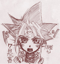 何故にイシズさんか…。ソレは昨日、遊戯王の再放送を見逃したから…。あーあ、死んだね、私。朝の5時くらいまで起きてたくせに、そのまま録画セットもしないで寝てしまうとは。イシズVS社長は、結構好きなデュエルだったりするんだけどな〜(涙)というわけでイシズさんなんですが、私、彼女の事良く分からないのです。手元に資料も無いからテキトウにこんなだったような…で描いたんですが…。なんか足りない。千年タウク?千年タウクってどんなカタチしてたっけ。とりあえず、初めて描いたイシズさんなんで、ま、こんなでいいか〜(お前…)……連日この話題ですが、もぅホントどうしようっ!城之内君の誕生日に急遽やりたいことが昨日浮かんで、カリカリカリカリ描いてるんですが、大体6枚の絵を描かないといかんのです。今から6枚はムリだよハニー…。最高でも1日に2枚までしか出来ないのに、イロイロ考えて、出来そうな枚数はせいぜい3枚…。あと半分はっ!? ううっ、誕生日過ぎてからupなんてイヤだ(涙)コレをアナログで塗るのはもっとしんどい…。画像が荒れるっ!アナログはアナログで2枚塗りたいのがあるし…。 アンタどんだけ描きたいの!? |